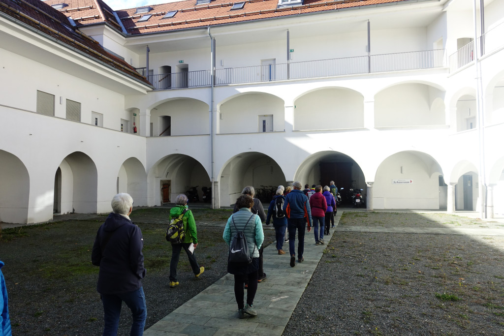 Da in den Nationalfeiertag ein wenig Geschichte einfließen sollte organisierten die Naturfreunde St. Stefan eine geschichtliche Stadtwanderung durch Villach. Gemeinsam marschierten 24 Mitglieder vorerst entlang der Drau bis zur Kirche St. Martin, der ältesten Kirche der Stadt. Von Raimund gab es kurze Informationen zur Kirche und zum Dinzlschloss.