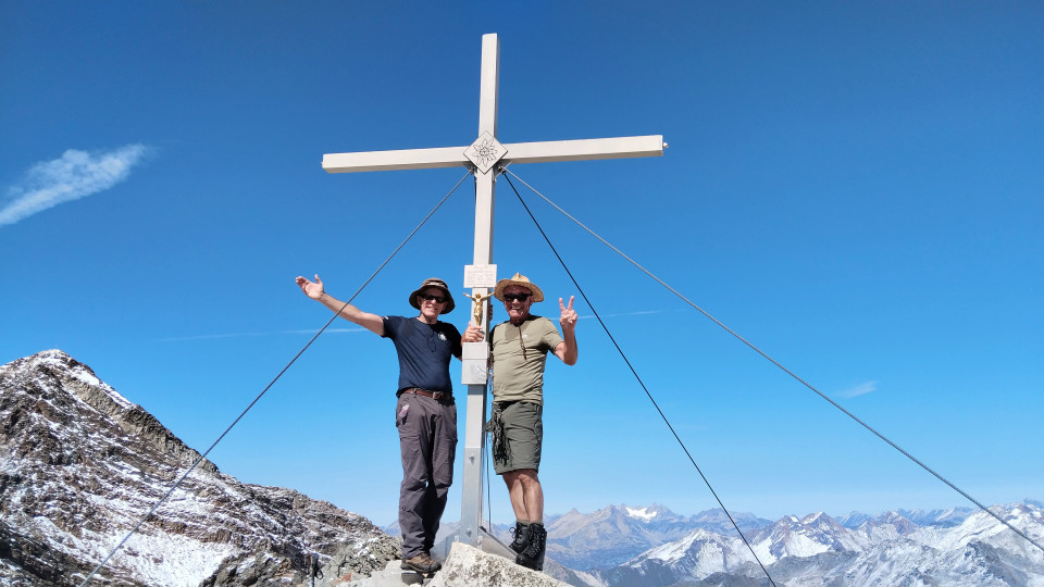 Wolfgang und Johann gingen weiter auf das Fernerköpfl. Über Felsblöcke, durch kleinere Schneefelder und in Serpentinen, zum Schluss über hohe Stufen, erreichten sie nach einer Stunde den Gipfel mit dem prächtigen Gipfelkreuz.